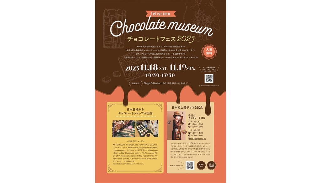 フェリシモが展開する「felissimo chocolate museum[フェリシモ チョコレート ミュージアム]」は、第2回『チョコレートフェス2023』を、神戸市中央区にあるStage Felissimo 1Fホールと3Fで、11月18日(土)・19日(日)に開催します。昨年が初開催で、約... -