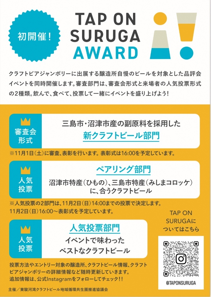 今回、このプロジェクトの一環として、県内のクラフトビールを部門ごとに表彰する「TAP ON SURUGA AWARD」が初開催されます。