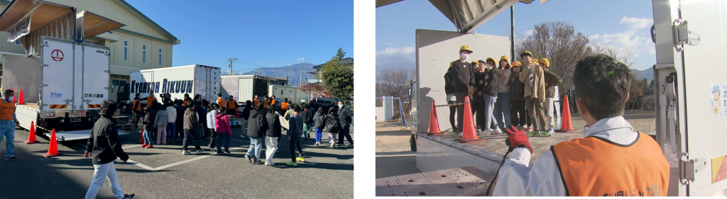 後半は、校庭に集結したトラックを使っての実地体験へ。山梨県トラック協会青年部の協力のもと、子供たちは巨大なウイング車の荷台や、冷凍車の内部を見学しました。