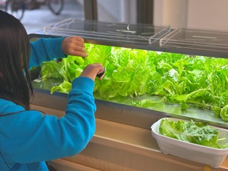 「街中植物工場」では、レタスやハーブがすくすくと育ちます。 最大の見せ場は、6週間に1度開催される「レタス会」。