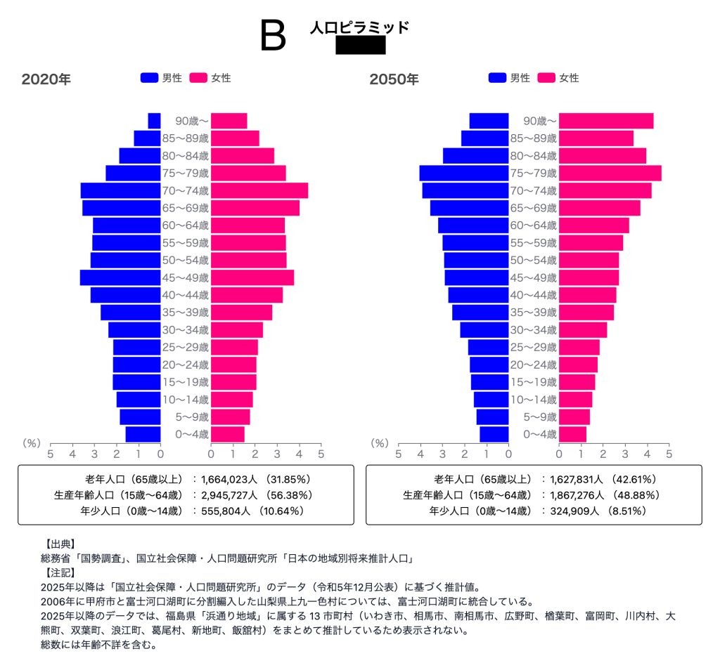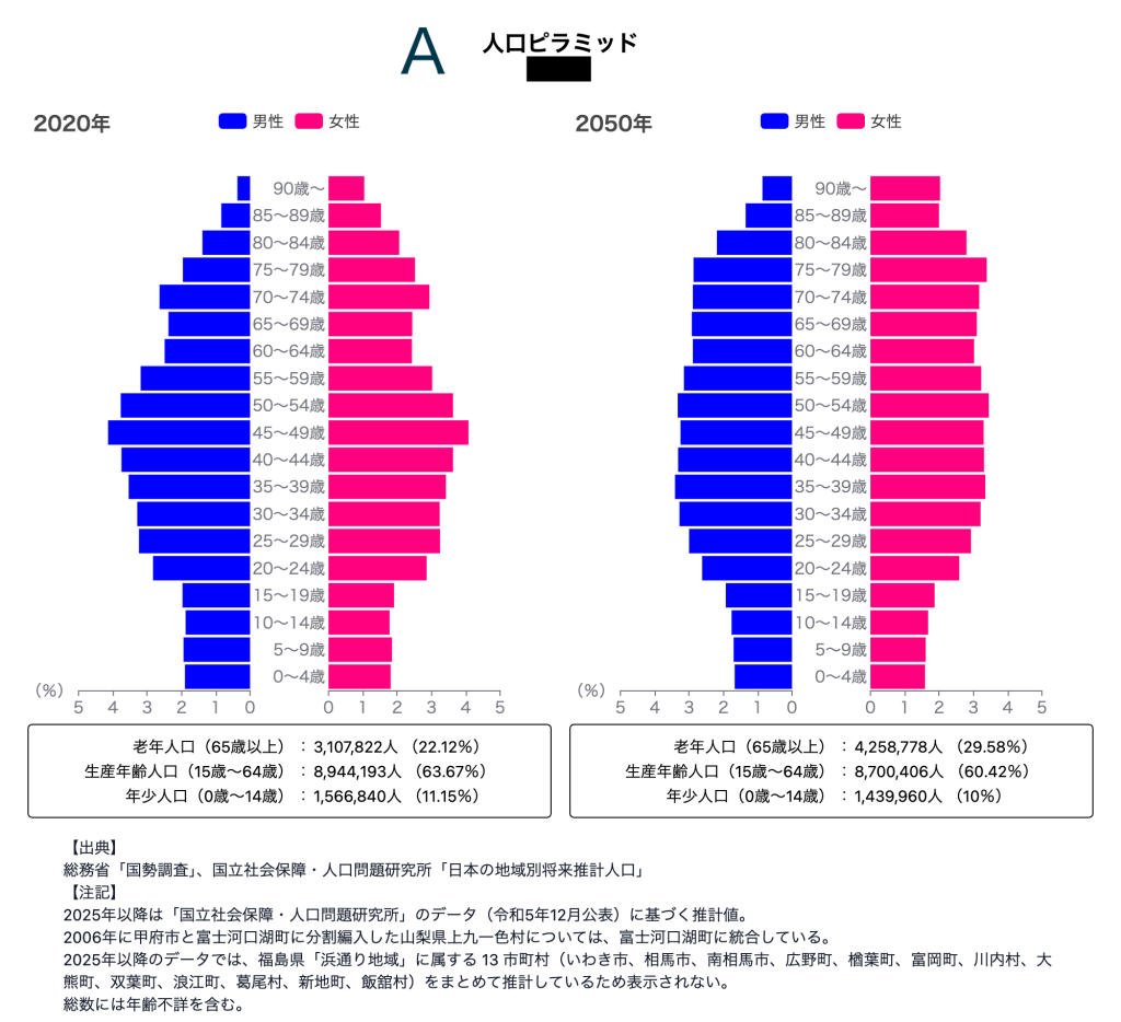 次の2枚の画像は、2020年と2050年(予測)の北海道と東京の人口ピラミッドです。どちらが北海道の人口ピラミッドでしょうか?