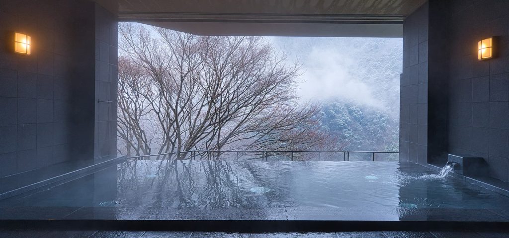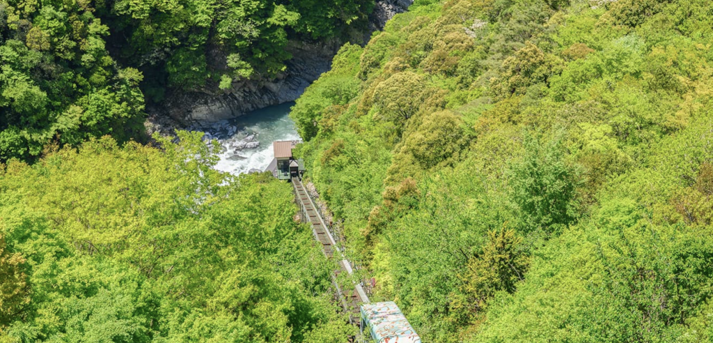 そんな祖谷渓の谷底で楽しめる露天風呂。ケーブルカーに乗って、傾斜角42度の断崖を、ゆっくりと大パノラマの景色を一望しながら下っていきます。四季の景色を感じながら、ゆっくりと浸かる時間は至福のひと時。