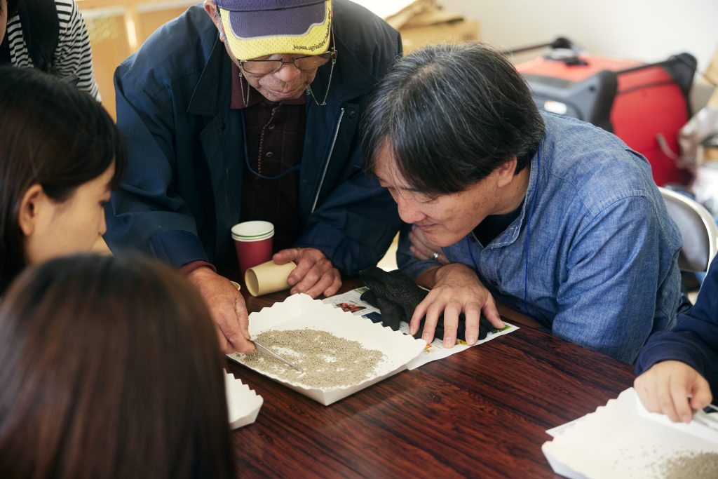 農業体験として、収穫したえごまからごみを取り除く作業をお手伝いさせてもらいました。実際にやってみると、粒の細かなえごまの実と不要物との見極めが難しい作業だとわかります。ですが、この「までい(ていねい)な」作業がおいしくて健康な食品を作るのに欠かせないそう。