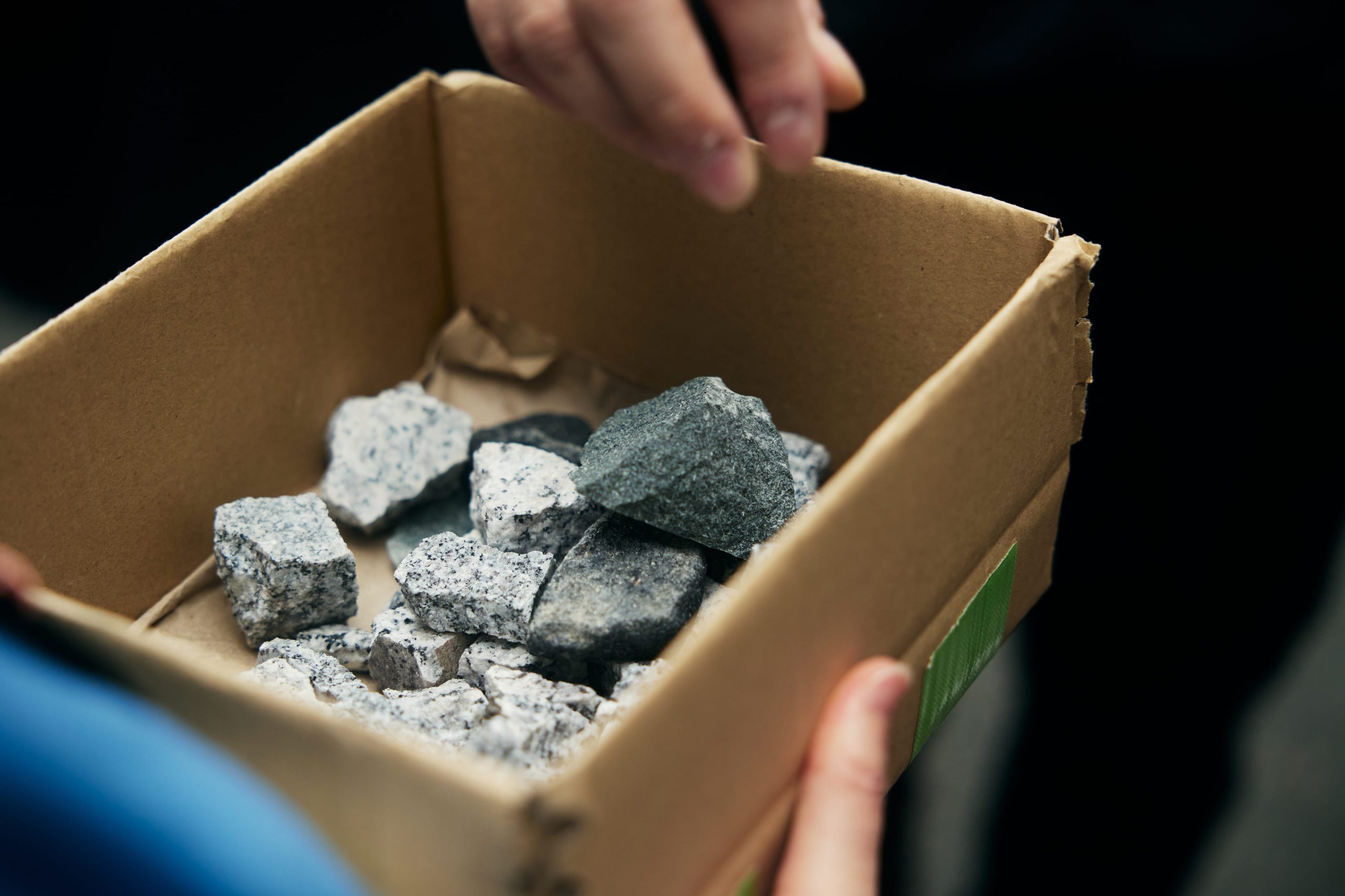 今回は、町内の『芦口石材店』でいただいた墓石用の御影石(花崗岩の通称)を使ってアクセサリーを作ってみようというのがテーマでした。大正13年に創業した『芦口石材店』に伺い、工場を見学しながら石材業の課題やこれからの会社の展望などをお聞きした後、お土産に御影石の端材をいただいてきました。