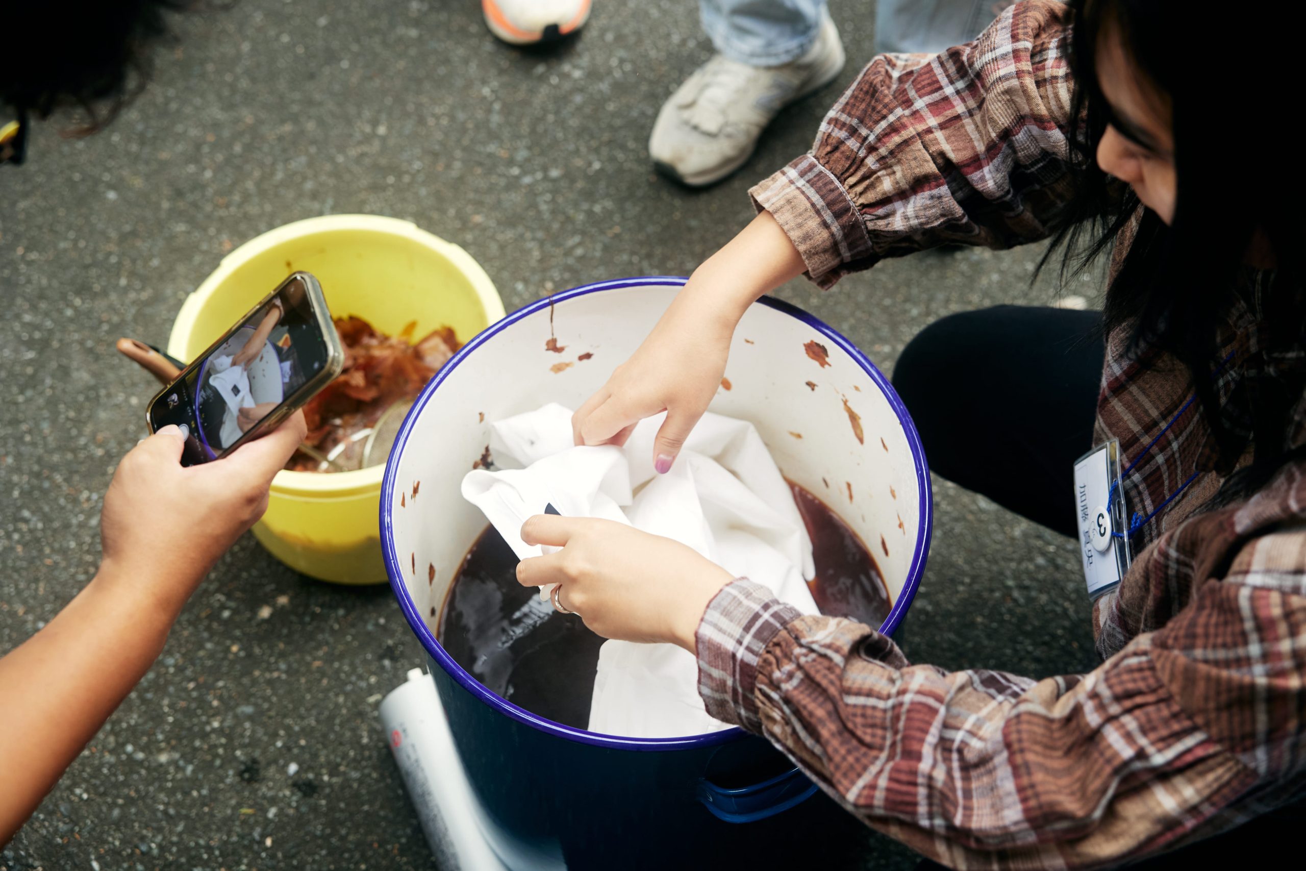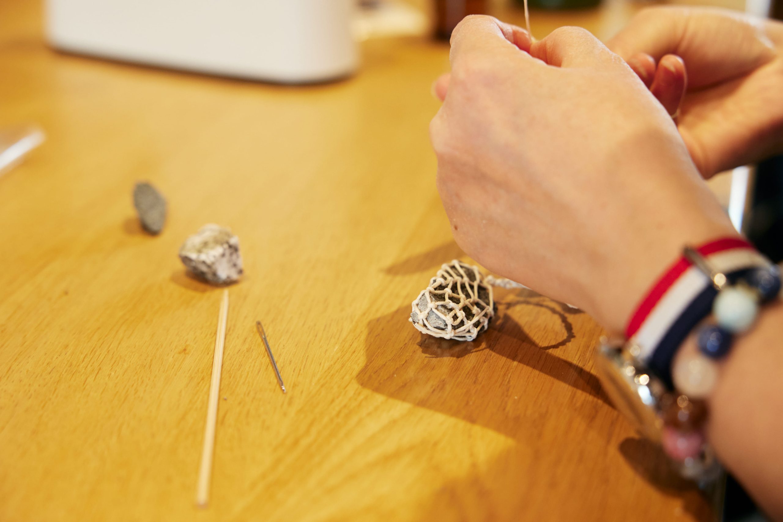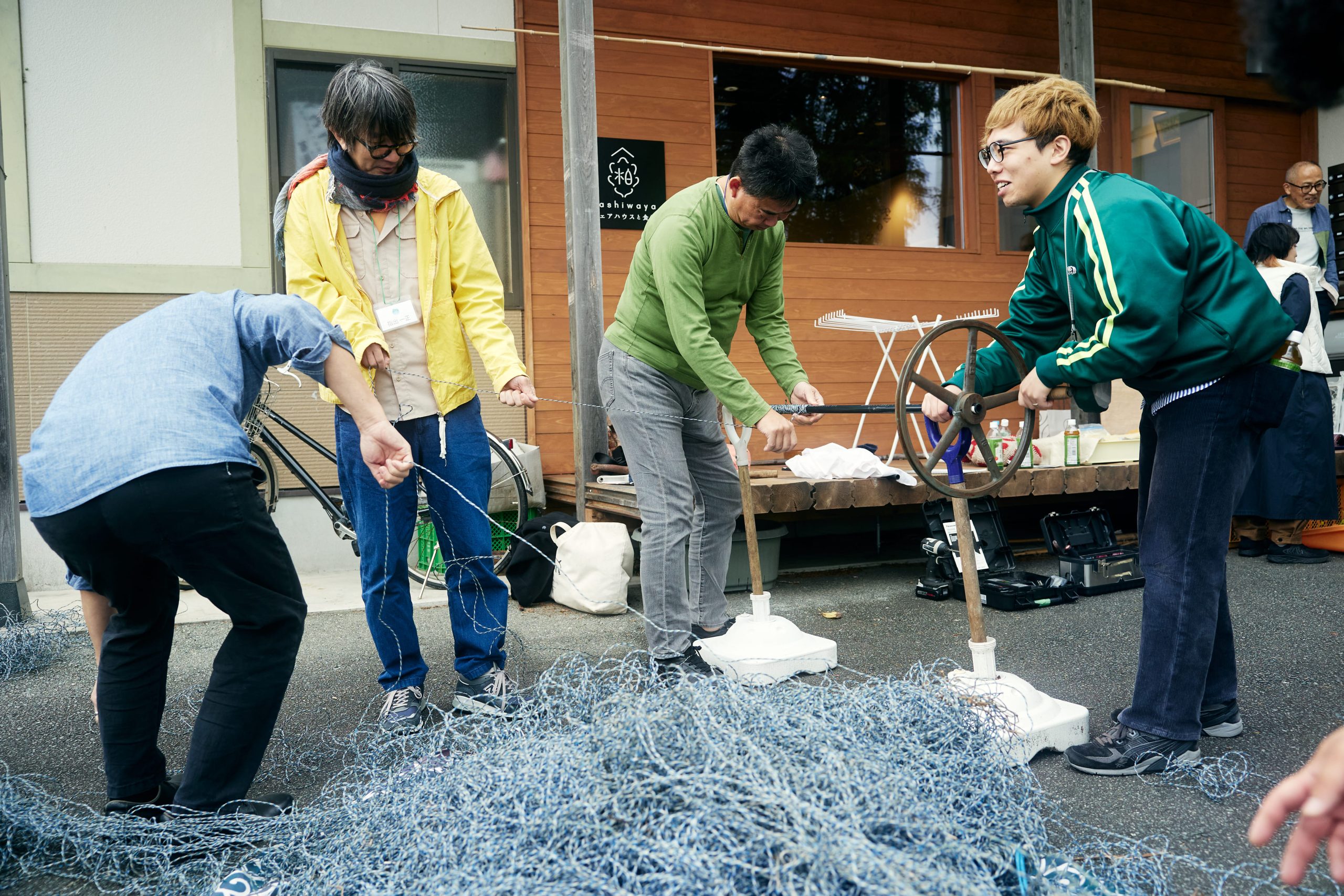 「kashiwaya」へ戻り、グループに分かれてワークショップを行います。いただいた御影石でアクセサリーを作る、楢葉町に自生している葛の葉の繊維で草木染めをする、獣害対策で使われていた電線を片づける、「kashiwaya」のオリジナルグッズを作るなど……参加者それぞれの特技に合わせて楽しく賑やかな時間を過ごしました。