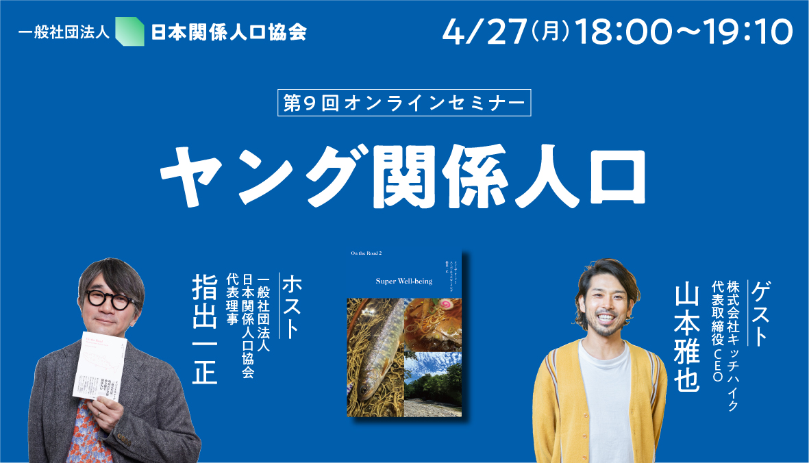 (一社)日本関係人口協会がお送りするオンラインセミナー。通算第9回となる今回は、代表理事・指出一正の最新著書『オン・ザ・ロード2 スーパーウェルビーイング』 をテキストにした新シリーズがスタートします。本シリーズでは、これからの地域との関わり方を決定づける「7つのキーワード」 を一つずつ深掘りしていきます。その第1弾として取り上げるのは、「ヤング関係人口」。指出氏が「目の前のヤングコーン」から着想したというこの言葉には、関係人口の裾野を広げるための重要なヒントが隠されています。