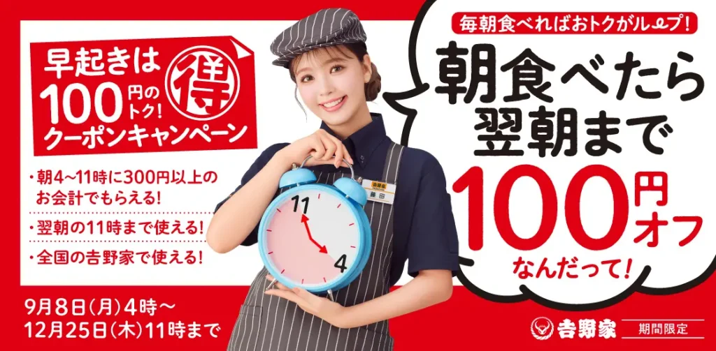 2025年9月8日(月)から12月25日(木)までの期間限定で、「吉野家」が驚くほどお得なキャンペーンを開催しています。朝4時から昼11時までの間に、店内またはテイクアウトで税込300円以上の会計をすると、レシートに「100円引きクーポン」が印字されるんです。
