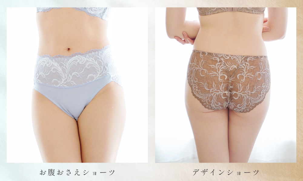 ブラジャーとペアコーデが楽しめるショーツも、「デザインショーツ」と「お腹おさえショーツ」の2タイプで展開。 どちらもブラジャーと同じ華やかなレースをたっぷり使い、軽やかかつ高級感ある見た目に仕上げられています。 「デザインショーツ」はヒップの丸みを包み込み、「お腹おさえショーツ」はフルカップ風のコンセプトに合わせたすっぽり感で安心感を高めます。
