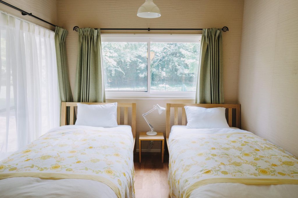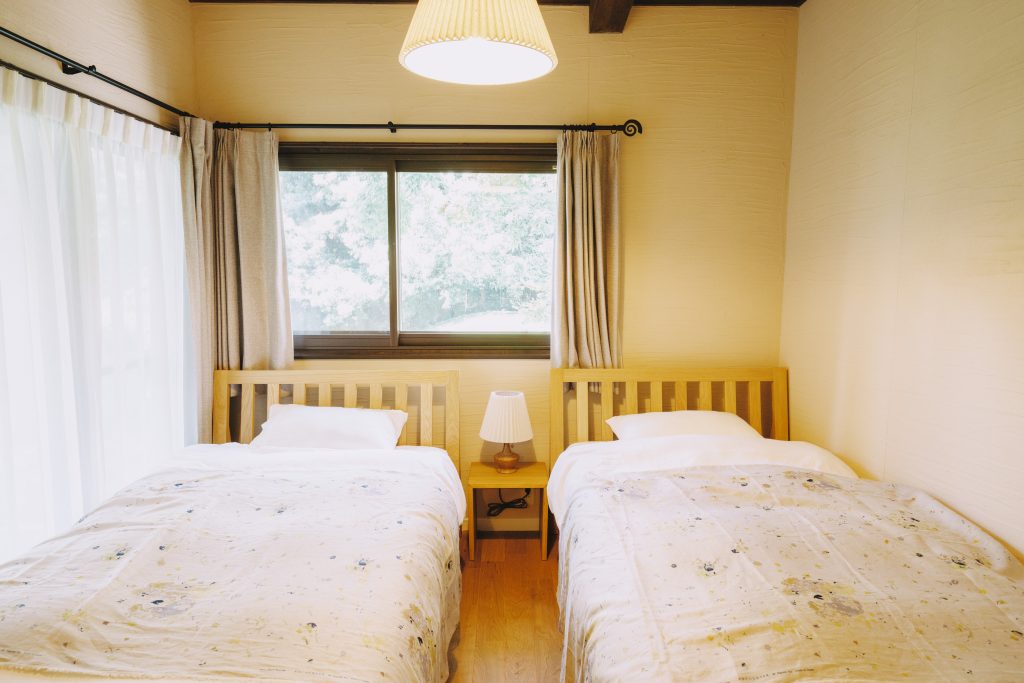 • 3号棟「萌黄(Moegi):野焼き後の新緑を表す春の部屋。キッチンを備えた洋室タイプで、ペット同伴可。春に芽吹く阿蘇の力強さを感じさせる一棟です。