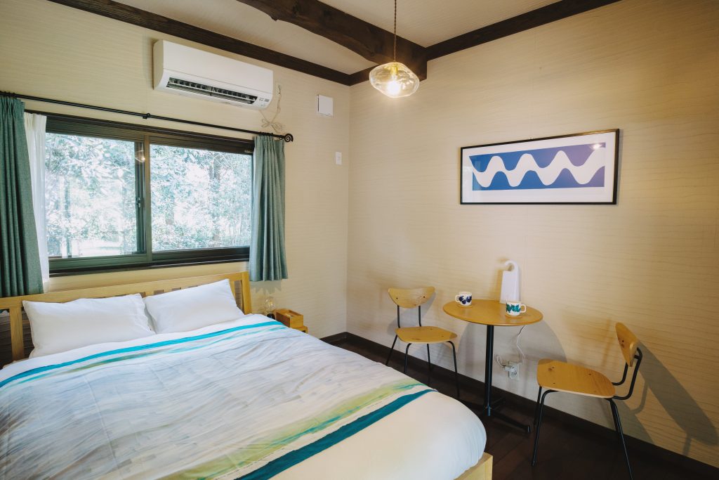 • 1号棟「湧水(Yūsui):阿蘇の象徴である豊かな湧水にちなんだ客室。ダブルベッドが配された洋室タイプで、清涼感あるデザイン。窓の外には木々が揺れ、南阿蘇らしい水と緑の調和を楽しむことができます。