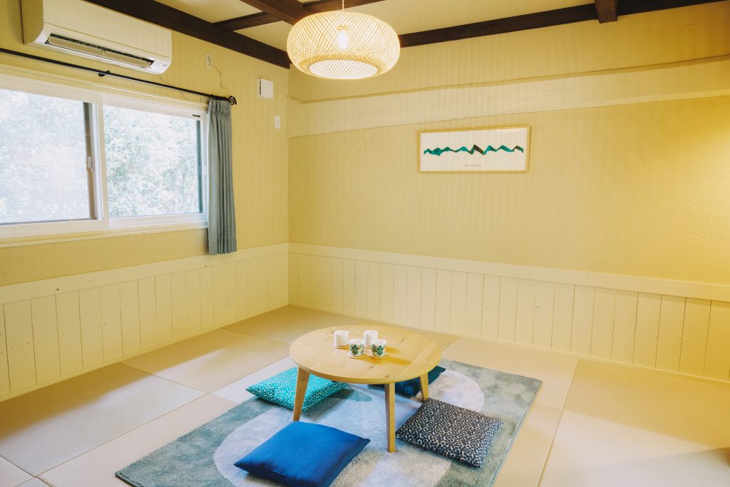 • 4号棟「草丘(Soukyu):草原と青空を象徴する夏の部屋。8帖の和室で最大4名まで滞在可能。草千里や大観峰の雄大な風景をイメージさせる開放的な設えです。