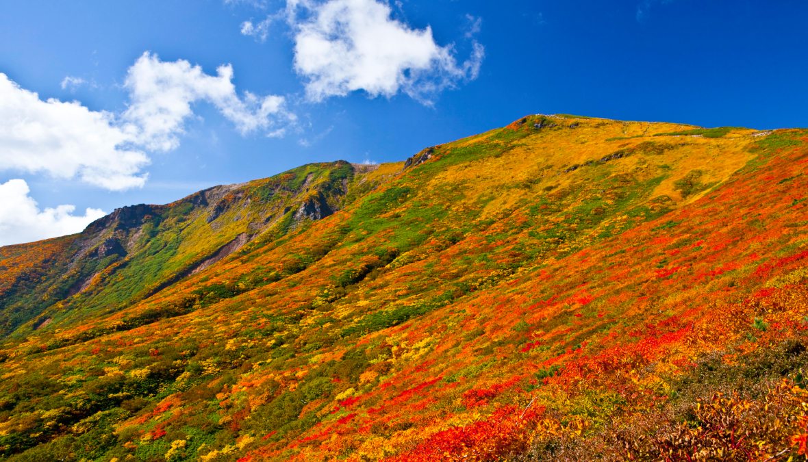 八甲田連峰は、ブナ林や湿原・渓谷が織りなす北東北屈指の紅葉スポットです。見頃は9月下旬〜10月中旬で、ロープウェイからの眺めは特に圧巻ですが混雑には注意が必要です。平日や早朝は静けさが増し、水鏡に映る山肌に出会えることもあります。下山後は酸ヶ湯温泉など名湯が近く、アクセスの良さと山岳の迫力を同時に楽しめます。