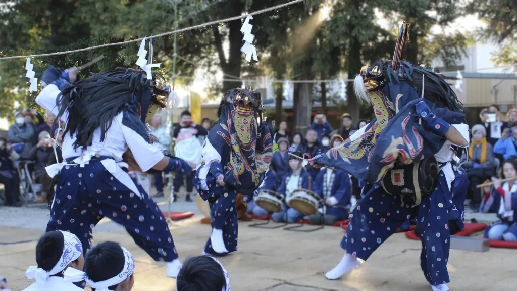 赤沼獅子舞(春日部市無形民俗文化財)は、一人立三頭獅子で、獅子舞と神楽が共存します。豊作や無病息災を祈願して、春と秋の例大祭で奉納されてきました。昭和36年頃に、担い手不足により一時中断したものの、赤沼民俗文化財保存会が中心となり、かつての担い手とともに昭和61年頃に復活。復活の過程で、女性や子どもたちの参加を集い、平成10年頃から開始した「子ども獅子舞」では、子どもたちだけで獅子舞を披露し、小学生を中心に10名の子どもたちが活躍しています。また、若手の女性の舞手も誕生し、新しい形で伝承が進められています。