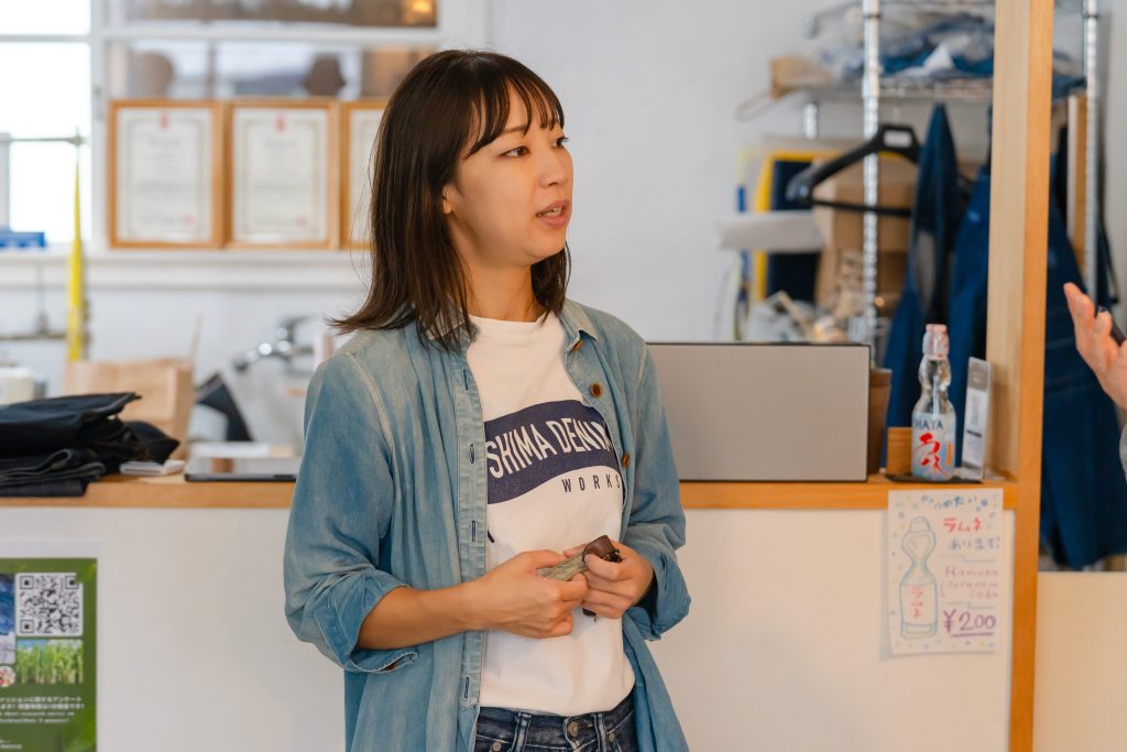 「バガス」から作られた糸は、いわば紙の糸のようなもの。吸水性や速乾性に優れており、消臭効果や抗菌作用も基準値より高いとされています。素材は100パーセント沖縄県産ですが、製造の過程でどうしても他県の工場を経由しているそう。「SHIMA DENIM WORKS」の大本夕貴さんは、将来的には全て沖縄県産にできるよう、またそれらを通して産業の活性化につながるよう、県とともに取り組んでいきたいと話します。