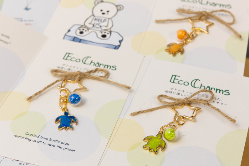 (キャプション) ペットボトルキャップが宝石のように輝く「EcoCharms」。一つひとつ風合いが異なるハンドメイドの温もりが魅力。