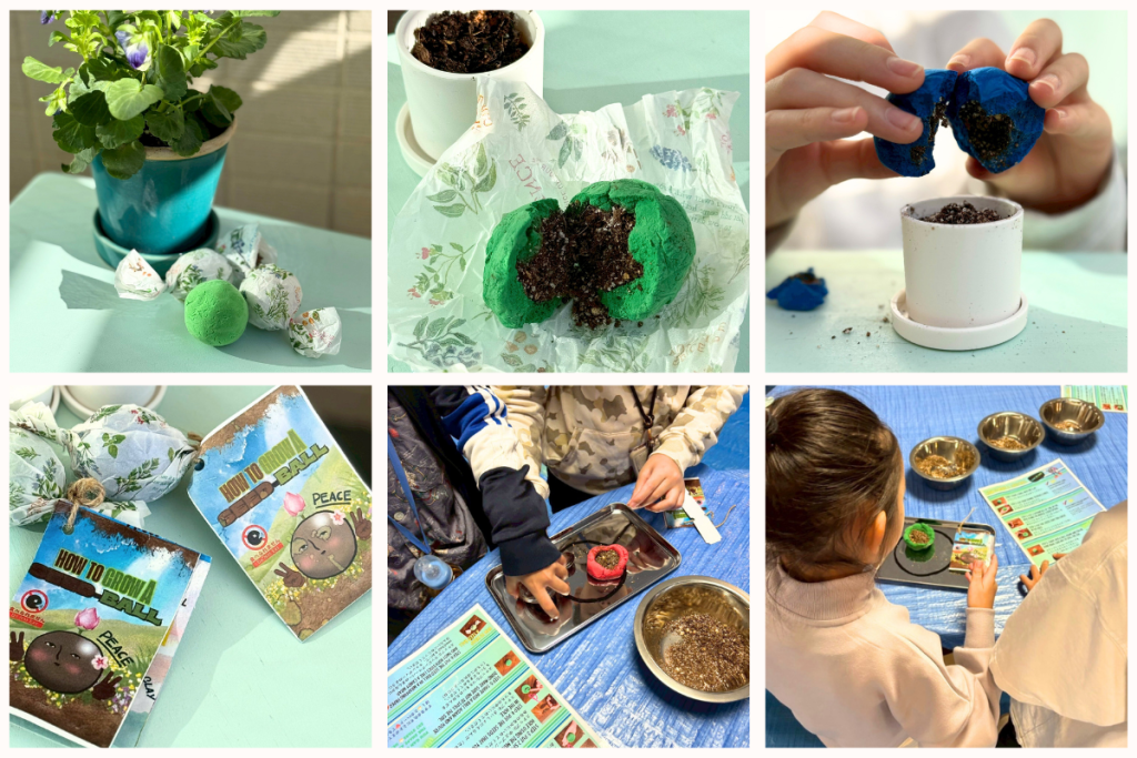 「遊びが学びに、学びが社会に」を掲げる彼らの活動らしく、泥遊び感覚で楽しみながら地球の未来を考えるきっかけを届けてくれます。所要時間はわずか15分。小さな手から生まれるカラフルなボールは、そのまま持ち帰って自宅のプランターや庭で「未来の花」を咲かせることができます。