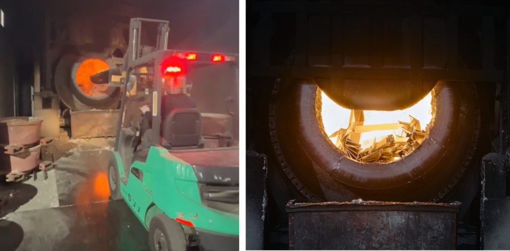 今回タッグを組んだのは、長野県松本市でアルミニウム再生を行う「株式会社カンノ」。回収されたチューブは溶解炉で800℃まで加熱され、不純物を取り除いた「再生アルミニウム地金」へと姿を変えます。