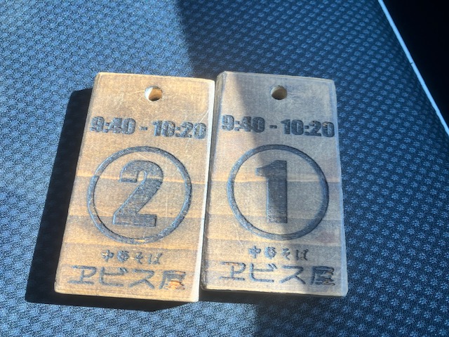 8:20、店の前に着くとすでに4人が並んでいる。ってことは自分たちは第1陣で入れるか!と喜んだものの、前の人の連れが来たので、自分の前には5人。なので第2陣の札を2枚とる。時間は0940〜10:20と1時間くらい間がある。
