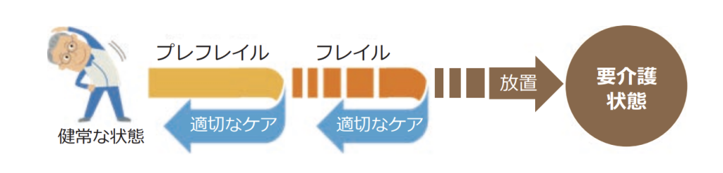 厚生労働省研究班の報告書では「加齢とともに心身の活力(運動機能や認知機能等)が低下し、複数の慢性疾患の併存などの影響もあり、生活機能が障害され、心身の脆弱性が出現した状態であるが、一方で適切な介入・支援により、生活機能の維持向上が可能な状態像」とされています。