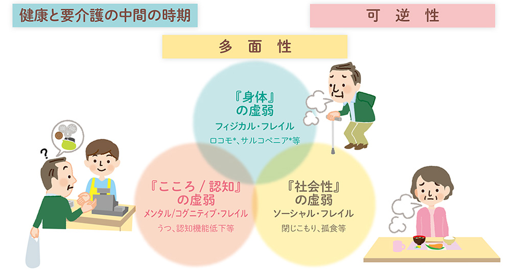 ①身体の虚弱は、骨や関節、筋肉など運動器の衰えが原因で、歩行や立ち座りなどの日常生活に支障を来している状態である「ロコモティブシンドローム(ロコモ)」や、加齢に伴って筋肉量が減少する状態である「サルコペニア」が該当します。一般的にイメージされる老化現象が、これに当たりそうですね。