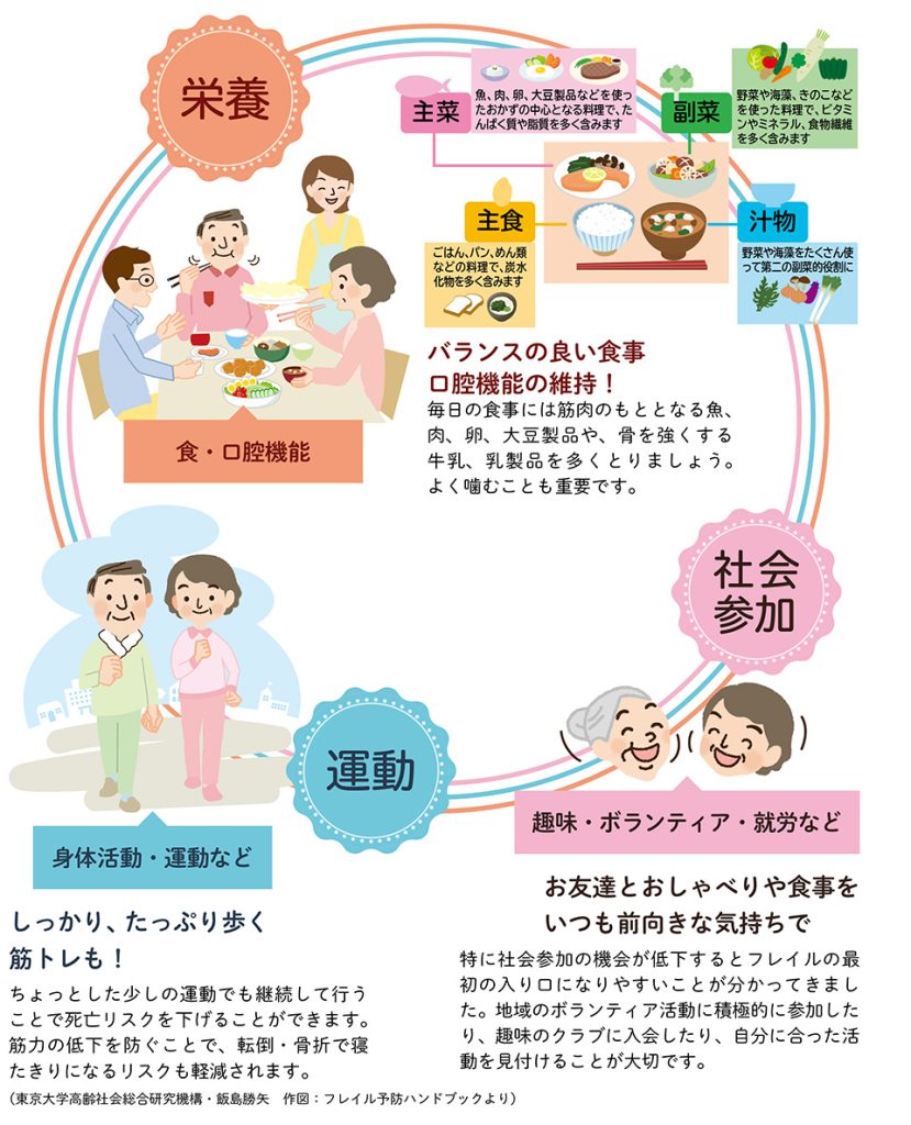 これら3つの虚弱を改善することが、フレイルの予防につながります。運動すること、バランスの良い食事をよく噛んで食べること、そして自分に合った社会参加の方法を見つけることです。